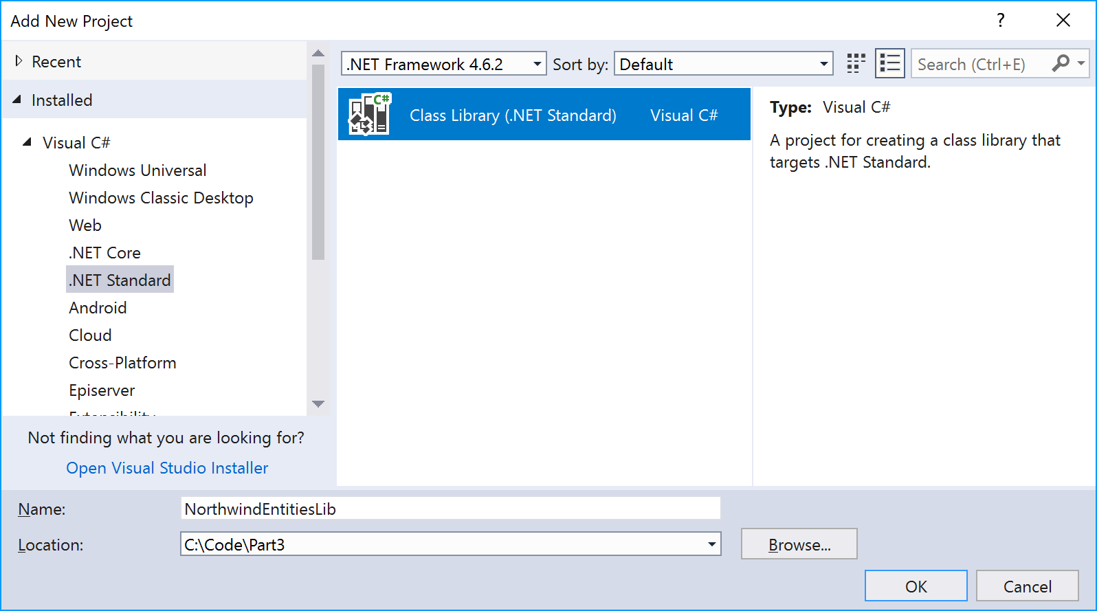 In the Add New Project dialog, in the Installed list, expand Visual C#, and select .NET Standard. In the center list, select Class Library (.NET Standard), type the name as NorthwindEntitiesLib, type the location as C:\Code\Part3, and then click on OK, as shown in the following screenshot: