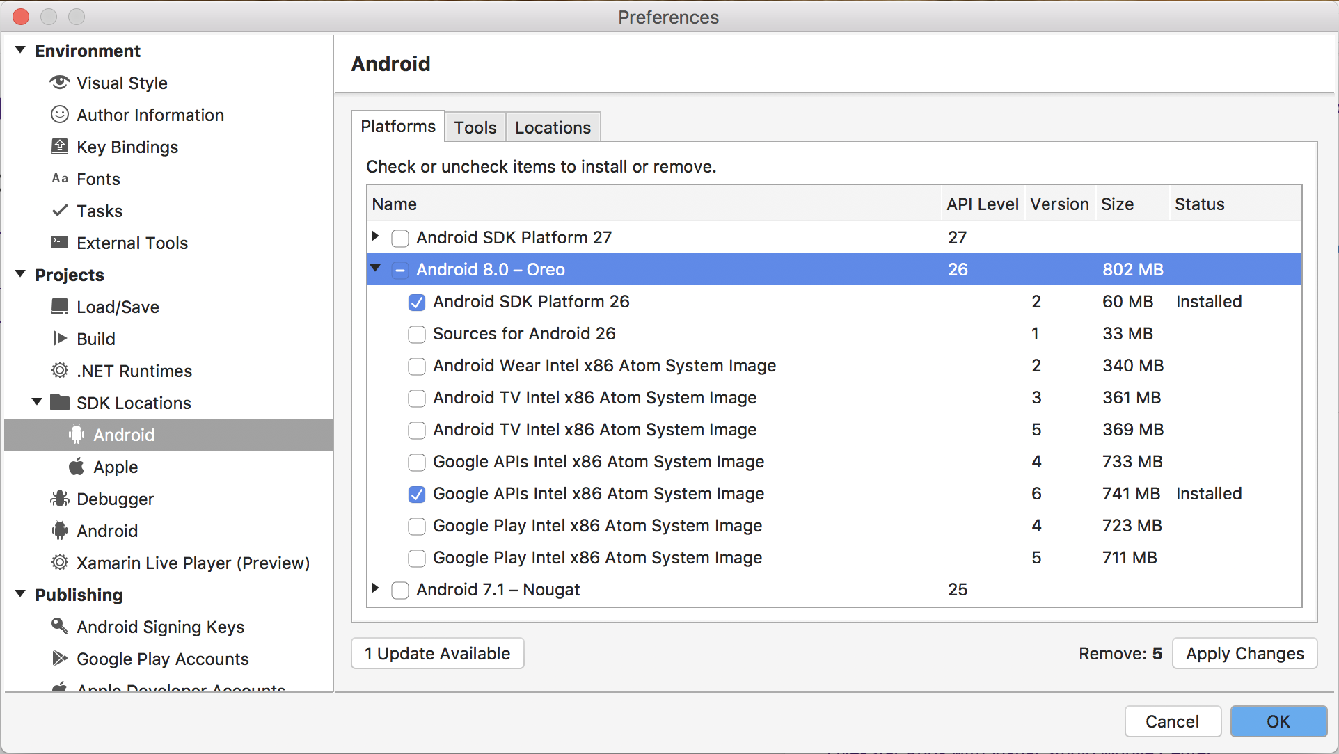 In Preferences, navigate to Projects | SDK Locations, and select the Platforms you want, for example, Android 8.0 - Oreo, as shown in the following screenshot:
